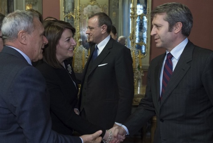 Il Presidente del Senato nell'esercizio delle funzioni del Presidente della Repubblica, Pietro Grasso, con la Presidente della Repubblica del Kosovo Atifete Jahjaga e il Sottosegretario di Stato agli Affari Esteri Benedetto Della Vedova