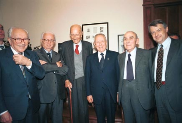 Visita alla città di Milano - Incontro, presso la sede del quotidiano "Corriere della Sera", con (da destra) il Direttore Ferruccio De Bortoli, Gaetano Afeltra, Indro Montanelli, Enzo Biagi e Arrigo Levi.