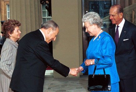 Il Presidente Ciampi accompagnato dalla consorte Franca Pilla viene accolto dalla Regina Elisabetta II e dal Principe Filippo di Edimburgo a Buckingham Palace.