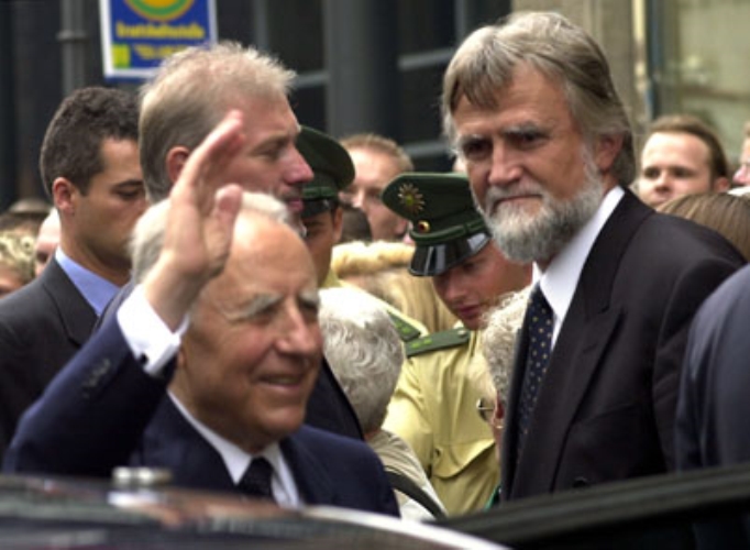 Il Presidente Ciampi con il Rettore Prof. Volker Bigl all'uscita dell'Università di Lipsia.