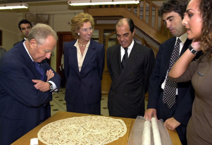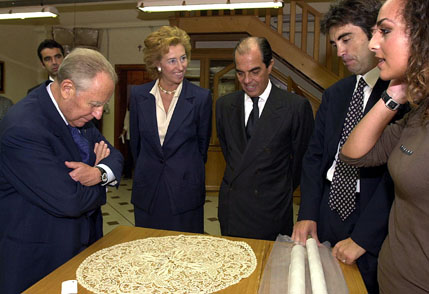 Il Presidente Ciampi osserva un prodotto lavorato da una ospite della Comunità, a destra nella foto. A fianco del Presidente Letizia e Gianmarco Moratti e Andrea Muccioli.