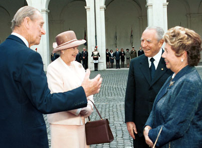 S.M. la Regina Elisabetta II e il Principe Filippo con il Presidente della Repubblica Carlo Azeglio Ciampi e la moglie Franca Pilla durante l'arrivo al Quirinale.