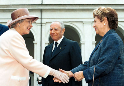 S.M. la Regina Elisabetta II viene accolta al Quirinale dal Presidente della Repubblica Carlo Azeglio Ciampi e dalla moglie Franca Pilla.