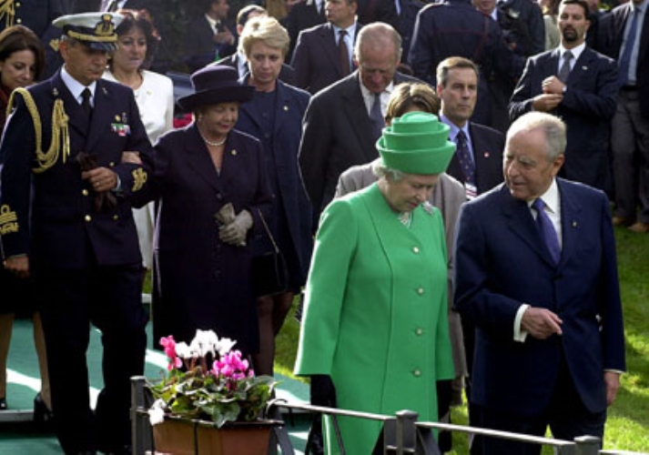 S.M. la Regina Elisabetta II e il Presidente Ciampi con la moglie Franca Pilla e il Principe Filippo al loro arrivo a Piazza di Siena in occasione del Carosello del Gruppo Squadrone Carabinieri a Cavallo.