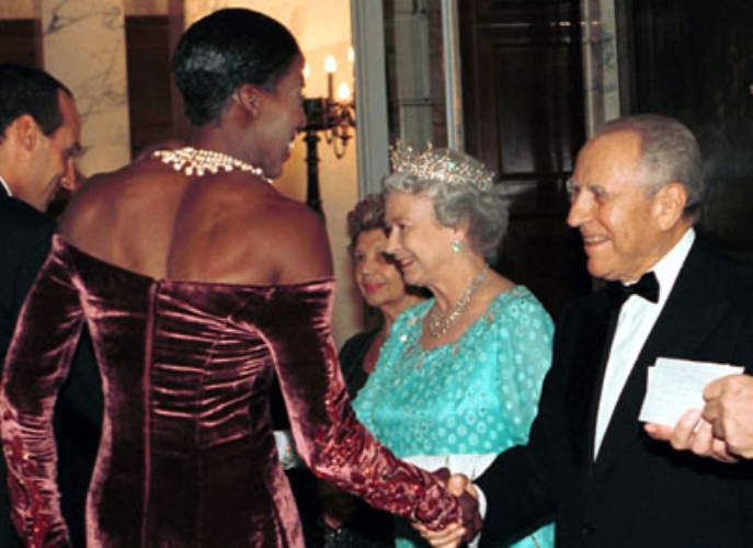 Il Presidente Ciampi, con a fianco S.M. la Regina Elisabetta II e la moglie Franca Pilla, saluta l'atleta Fiona May in occasione del ricevimento offerto dai Reali a Villa Wolkonsky.