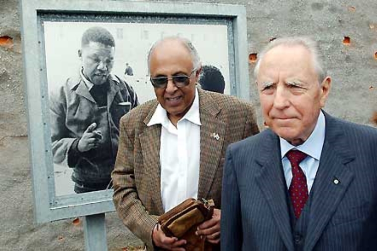 Il Presidente Ciampi con Ahmed Kathrada, compagno di prigionia di Nelson Mandela, mentre visita il Penitenziario di Robben Island, dove Mandela fu rinchiuso per 17 anni