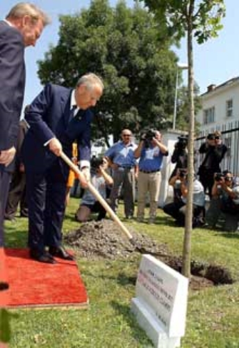 Il Presidente Ciampi con a fianco il Presidente della Repubblica Slovacca Schuster, mette a dimora,nei giardini presidenziali, "l'Albero dell'Amicizia".