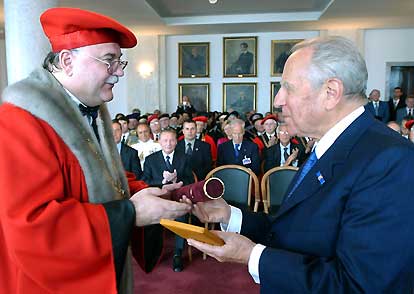 Il Presidente Ciampi con il Rettore dell'Università Ferdinand Devinsky che ha conferito al Capo dello Stato la "Grande Medaglia d'Oro"dell'Università Comenio.