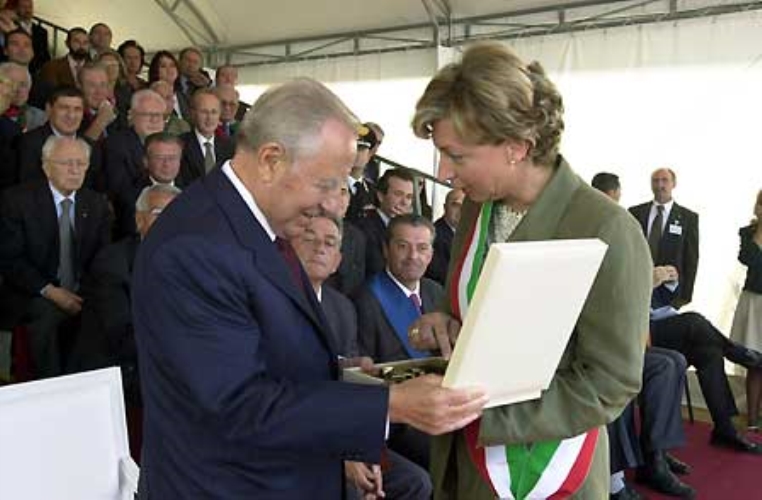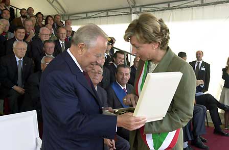 Il Presidente Ciampi riceve dal Sindaco di Larciano Roberta Beneforti, un bassorilievo dello scultore Dami, in occasione del cinquantesimo anniversario dell'Eccidio del Padule di Fucecchio.