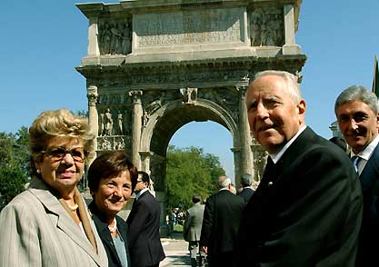 Il Presidente Ciampi con la moglie Franca davanti all'Arco di Traiano, in occasione della visita alla città. A lato della foto: il Presidente della Regione Campania Antonio Bassolino.