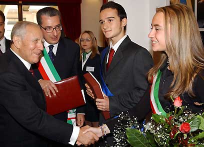 Il Presidente Ciampi con a fianco il Sindaco della città Sandro Nicola D'Alessandro, saluta due giovani Amministratori, Raffaele Folato e Melania Petriello, al suo arrivo al Teatro Comunale.