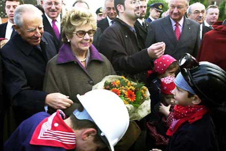 Il Presidente Ciampi insieme alla moglie Franca,vengono accolti da alcuni bambini che indossano gli abiti da minatori, al sito del "Bois du Cazier"