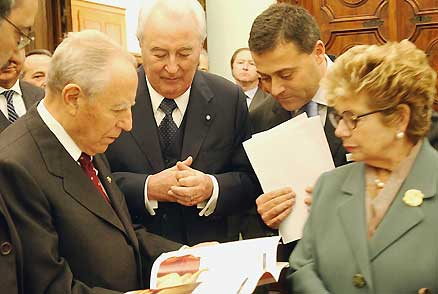 Il Presidente Ciampi, con la moglie Franca,il Presidente della Cassa di Risparmio di Ferrara Alfredo Santini ed il Presidente della Fondazione Sergio Lenzi, osserva un catalogo delle Opere di Dosso Dossi