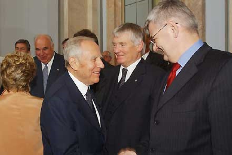 Il Presidente Ciampi saluta Fischer, nella foto con Schily e Kolh, durante la cerimonia di inaugurazione dell'Ambasciata Italiana