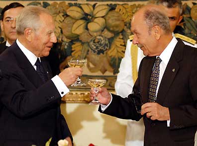 I Presidenti della Repubblica Italiana, Carlo Azeglio Ciampi e della Repubblica Ellenica, Constantinos Stephanopoulos, brindano, al termine dei rispettivi interventi, in occasione del pranzo ufficiale.
