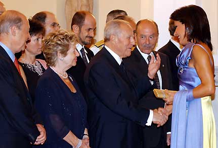 Il Presidente Ciampi con la moglie Franca, a fianco il Presidente della Repubblica Ellenica Constantinos Stephanopoulos ed il Primo Ministro Costas Simitis, saluta la signora Yanna Angelopoulos, Presidente del Comitato Organizzatore delle Olimpiadi "Athene 2004", in occasione del pranzo ufficiale al Palazzo Presidenziale.