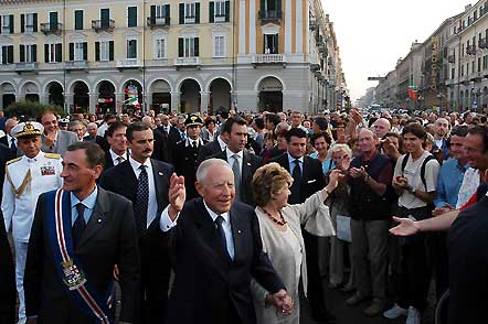 Il Presidente Ciampi con la moglie Franca in Piazza Galimberti risponde al saluto dei cittadini.