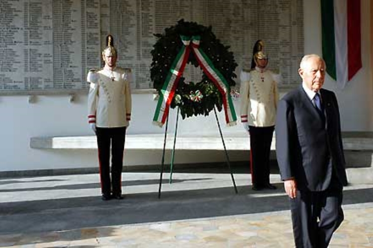 Il Presidente Ciampi davanti alla lapide commemorativa dell'eccidio dopo aver reso omaggio con una corona d'alloro