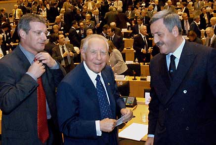 Il Presidente Ciampi con i Vice Presidente del Parlamento Europeo David Martin e Guido Podestà, al termine del messaggio al Parlamento Europeo, riunito nella Conferenza dei Presidenti in sessione straordinaria, aperta a tutti i Membri dell'Assemblea
