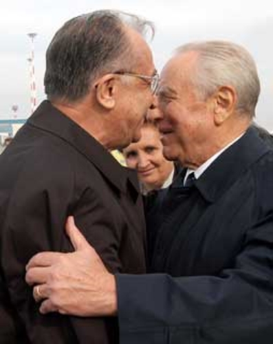 L'abbraccio tra i due Capi di Stato Ciampi ed Iliescu all'arrivo all'aeroporto di Otopeni