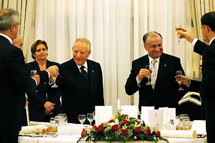 Il Presidente Ciampi con il Presidente della Repubblica di Romania Ion Iliescu durante il brindisi del Pranzo di Stato a Palazzo Cotroceni