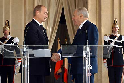 Il Presidente Ciampi e Vladimir Putin, Presidente della Federazione Russa Vladimir Putin, al termine delle dichiarazioni alla stampa, subito dopo i colloqui.