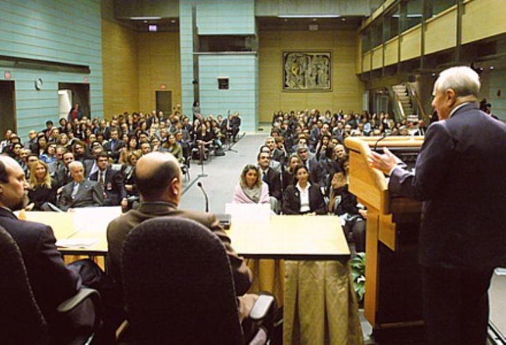 Il Presidente della Repubblica Italiana Carlo Azeglio Ciampi durante il suo saluto al personale italiano delle Istituzioni Finanziarie Internazionali presso il Preston Auditorium FMI-BM