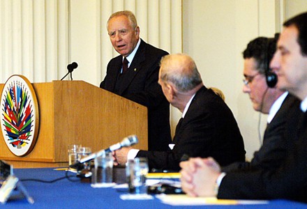 Il Presidente della Repubblica Carlo Azeglio Ciampi durante il suo intervento sul tema "Americhe e Europa" nella sede dell'Organizzazione degli Stati Americani.
