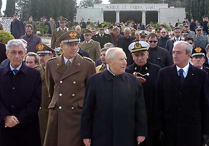 Il Presidente Ciampi, accompagnato dal Ministro della Difesa Antonio Martino e dal Presidente della Regione Antonio Bassolino, dopo aver reso omaggio al Sacrario.