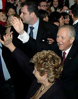 4. Il Presidente Ciampi e la moglie Franca rispondono al saluto della gente, all'arrivo alla Casa d...