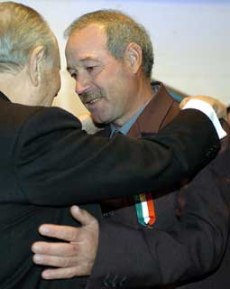 Il Presidente Ciampi abbraccia il Signor Antonio, papà di Luigi Piccolo, dopo avergli consegnato la Medaglia d'Oro al Valor Civile, durante la cerimonia alla Casa di Nazareth.