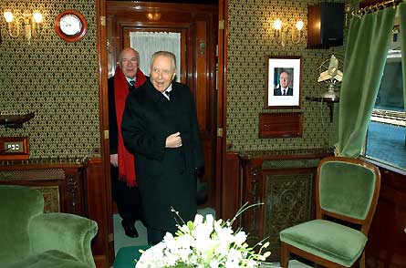 Il Presidente Ciampi, nella foto con Giancarlo Cimoli, Amministratore Delegato delle Ferrovie dello Stato, a bordo del Treno Presidenziale, per Livorno.