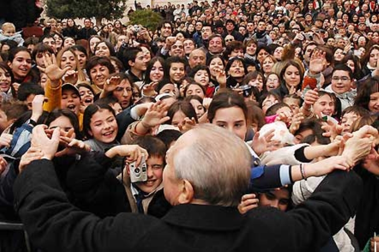 Il Presidente Ciampi in un abbraccio simbolico ai giovani al suo arrivo in Piazza Eleonora d'Arborea