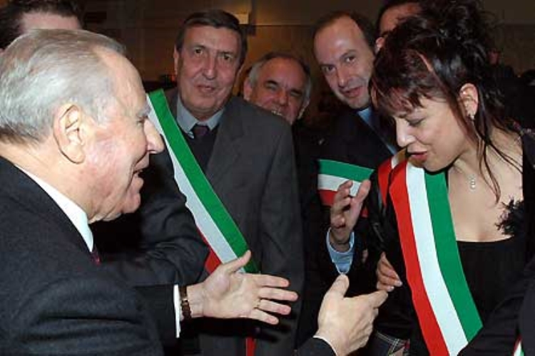 Il Presidente Ciampi tra i Sindaci della Provincia al termine del suo intervento al Teatro Comunale "Antonio Garau"
