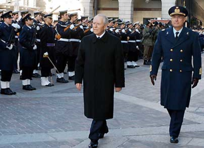 Il Presidente Ciampi, accompagnato dal Consigliere Militare Giovanni Mocci, al suo arrivo in Piazza Duomo, riceve gli onori militari.