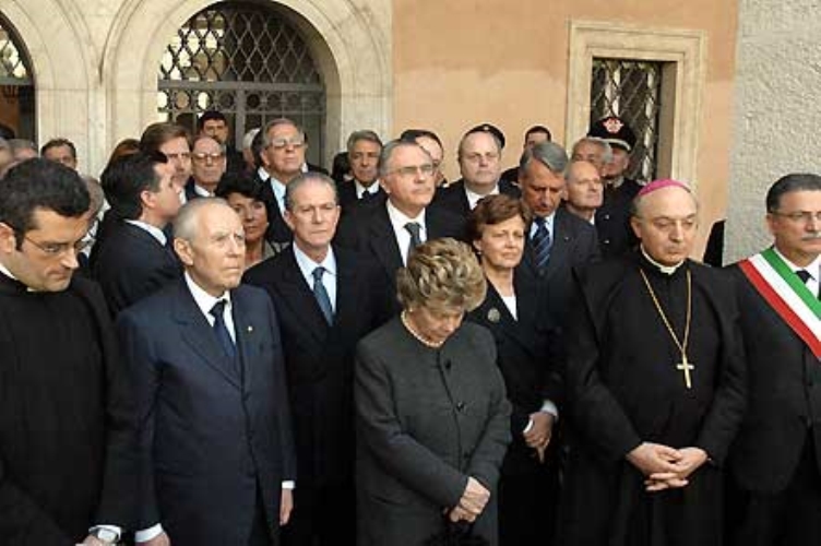 Il Presidente Ciampi con la moglie Franca, con il Ministro La Loggia, il Vice Presidente del Senato Fisichella e l'Abate Ordinario di Montecassino, Padre Bernardo d'Onorio, durante i tre minuti di silenzio in memoria delle vittime degli attentati terroristici a Madrid