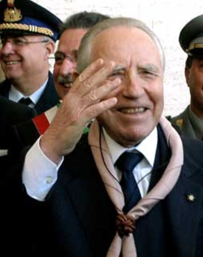 Il Presidente Ciampi, al suo arrivo all'Abbazia, saluta gli Scout che gli hanno fatto dono del fazzoletto di Capo