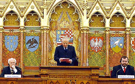 Il Presidente Ciampi, alla presenza del Presidente della Repubblica Ungherese Ferenc Madl e del Vice Presidente del Parlamento Laszlo Mandur,durante l' allocuzione.