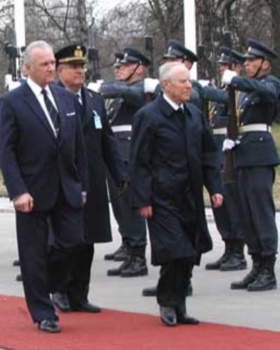 Il Presidente Ciampi accompagnato dal Presidente della Repubblica di Estonia Arnold Ruutel e dal Consigliere Militare Giovanni Mocci durante la cerimonia di benvenuto a Palazzo Presidenziale di Kodriorg.