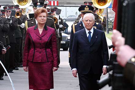 l Presidenti della Repubblica Italiana e della Repubblica di Lettonia Carlo Azeglio Ciampi e Vaira Vike-Freiberga, durante la cerimonia di benvenuto al Palazzo Presidenziale