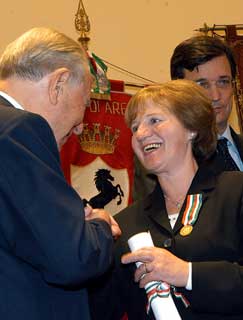 Il Presidente Ciampi consegna la Medaglia d'Oro al Merito Civile alla Signora Santina Visconti, vedova di Angelo Monaci, nel corso dell'incontro con le Autorità civili, militari, religiose ed i Sindaci della Provincia di Arezzo.