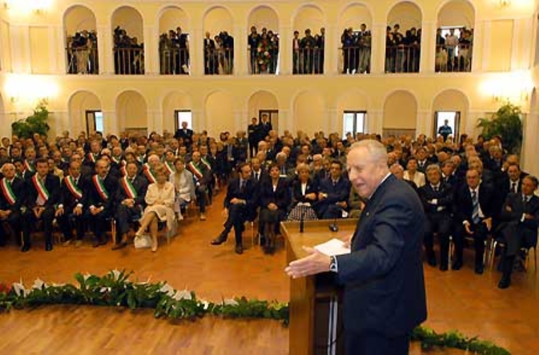 Il Presidente Ciampi durante il suo intervento, presenti le Autorità civili, militari, religiose ed i Sindaci della Provincia di Arezzo.