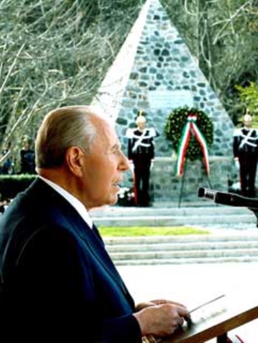 Il Presidente Ciampi durante il suo intervento a Moriago della Battaglia. Sullo sfondo: il Monumento ai Ragazzi del 99 e ai Caduti della Prima Guerra Mondiale