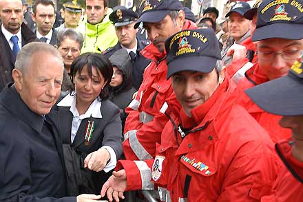 Il Presidente Ciampi, a fianco la Signora Colomba Orzini, vedova di Gianni Orzini, tra i colleghi del marito della Protezione Civile