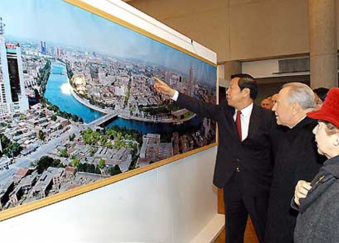 Il Presidente Ciampi con la moglie Franca durante la visita alla mostra "Sulla via di Tianjin:1000 anni di relazioni tra Italia e Cina", accompagnati dal Sindaco della città cinese,Dai Xianglong, all'Istituto Italiano di Cultura.