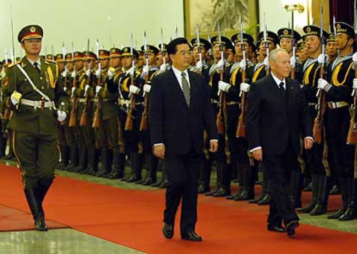 Il Presidente Ciampi con il Presidente della Repubblica Popolare Cinese, Hu Jintao, durante la cerimonia di accoglienza al Palazzo dell'Assemblea del Popolo.