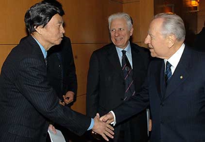 Il Presidente Ciampi saluta il Prof. Lu Tongliu, decano degli italianisti cinesi, in occasione dell'incontro con gli italianisti cinesi e studenti universitari di lingua italiana, al centro della foto il Rettore dell'Università di Bologna Prof. Ugo Calzolari.