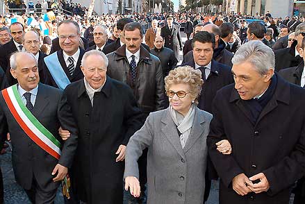 Il Presidente Ciampi in compagnia della moglie Franca, dei Presidenti della Regione e Provincia Bassolino e Villani e dal Sindaco De Biase, durante la passeggiata nel centro storico della città