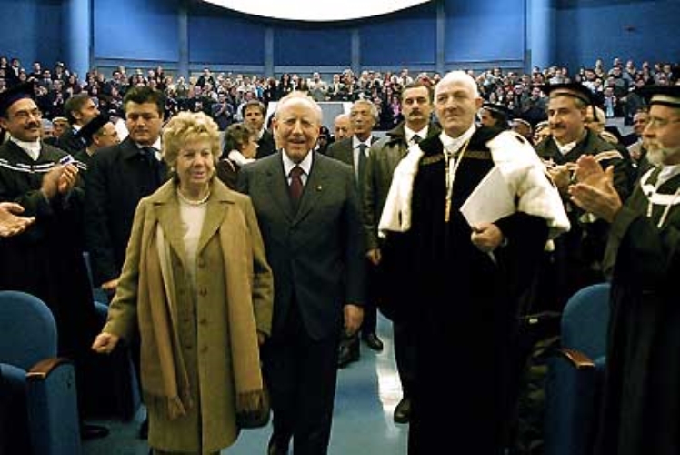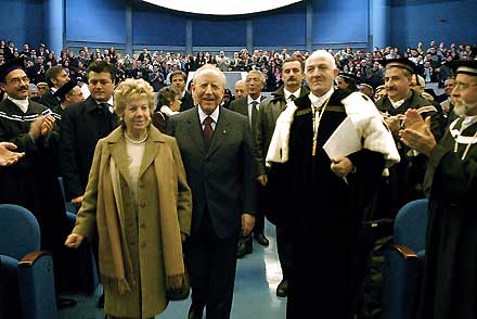 Il Presidente Ciampi in compagnia della moglie Franca e del Rettore dell'Università degli Studi di Salerno, Raimondo Pasquino, al suo ingresso nell'Aula Magna del Campus