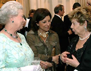 La Signora Franca Pilla Ciampi con S.M. la Regina Elisabetta II (al centro l'interprete), all'Ambasciata d'Italia, durante il ricevimento di restituzione.
